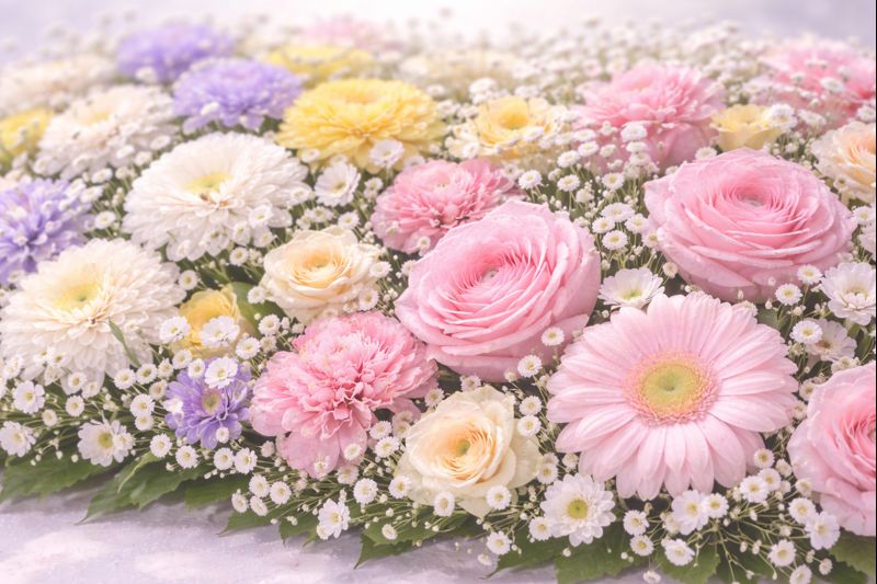 病気と闘い、自宅で療養されたとお伺いしました。最後まで自分のことは自分でされる強いお父様でいらっしゃり、「尊敬する」と仰っていましたね。祭壇の花には「尊敬」や「感謝」「思いやり」という花言葉を持つ、薄紫のバラや白いカーネーション、トルコ桔梗などをお入れさせて頂きました。また、空から皆様を照らしてくれるようにと向日葵などもお入れさせて頂きました。